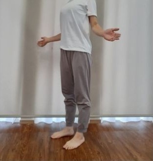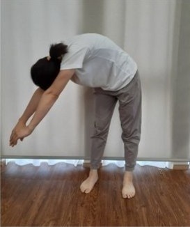 1.背すじを伸ばして立つ。息を吐きながら背中を丸め、同時に腕を内側にひねりながら前に伸ばしていく。手の甲が内側を向くように。目線はおへそに向ける。