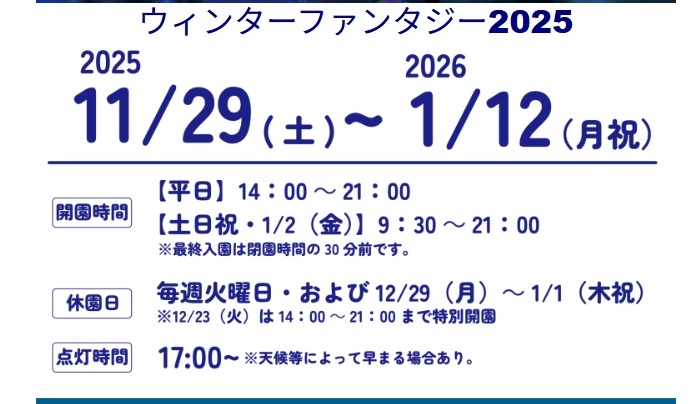 ◉点灯時間目安:17:00〜21:00、最終入園は閉園の約30分前。