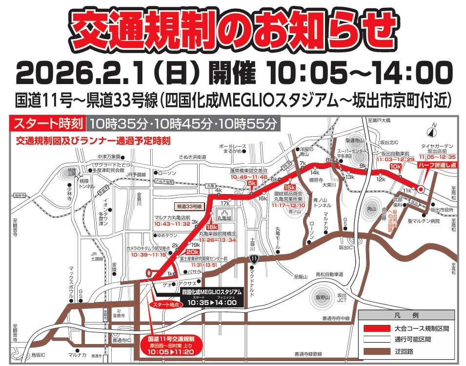当日は、県立丸亀競技場から坂出市京町付近までの国道11号と県道33号線で行われ、規制時間は2月1日(日)午前10時5分から午後2時までです。規制の開始は、先頭ランナーが通過する約8分前から開始され、規制解除はパトカー通過をもって行われます。