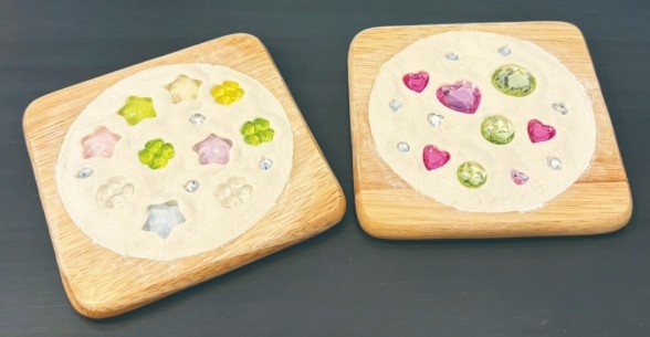 石粉ねんどを敷き詰め、お好みのビーズやシールを並べてデザインします。