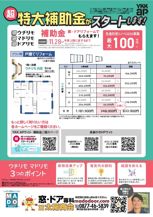 ㈲太陽商会 ポスティングチラシ 2026年窓リフォーム補助金のご案内★